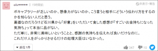 除了批评岸田不合时宜,还有日本民众指导起岸田说话的艺术:"不知道是缺乏词汇量,还是缺乏想象力,我认为这样的人不知道如何向对方表达自己的想法。本可以说虽然价格昂贵,但受到石川县的'好意',结果他在吃了之后的感想是'感觉自己成了超有钱的人',真的很没品。明明只是表达非常好吃和感谢的心情就好了。没有比这更让人失望的首相了。"