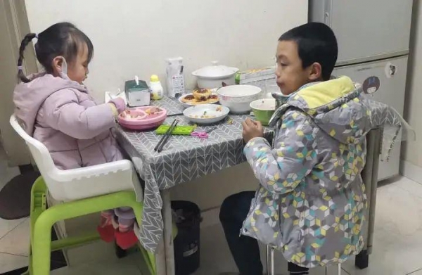 这几天,三年级的叶雨樵就成了 " 全家的希望 ",扛起了烧饭做菜和照顾妹妹的重任。薛女士说,儿子还是主动请缨的。