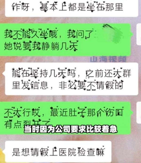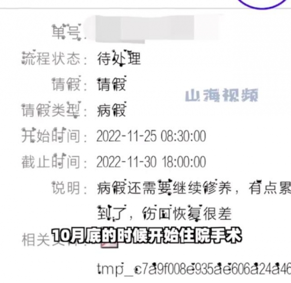 据悉,当事人冯女士是今年7月初入职的人事岗位,10月底开始住院手术,"医院给的假条是一个月的,我上了9天班是因为11月月中的时候就出院了。当时公司较忙便让我坚持带病上班,然后我就回去正常上班了。"