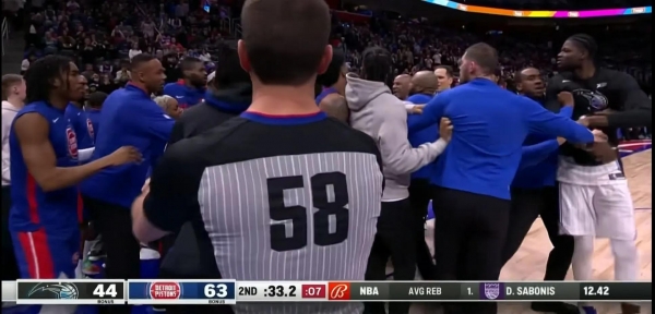 这时候工作人员以及教练员都想试图拉开双方球员距离,以避免冲突升级,但是情绪激动的球员都不愿意退去,双方球员嘴上还展开着骂战,场面一度十分的混乱,好在魔术球员最终还是将瓦格纳从活塞的替补席给解救了出来。