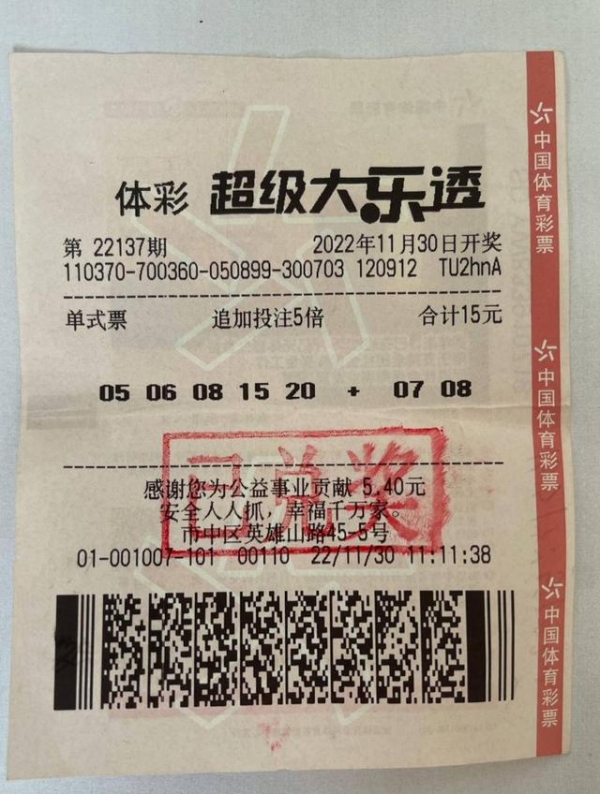 11月30日,体彩超级大乐透第22137期开奖,当期全国开出8注一等奖,其中5注为1224万余元(含544万余元追加奖金)追加投注一等奖,全部花落济南。济南购彩者幸运爆棚,凭借一张15元的彩票中得5注追加一等奖,单票总奖金61229660元,成就2022年山东体彩单票奖金最高奖!