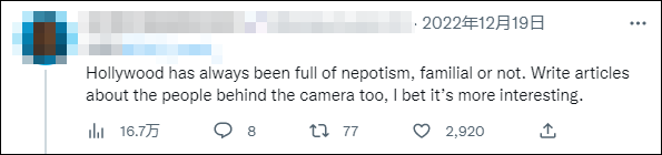 "好莱坞一直都充斥着裙带关系,不管是不是家族关系。也应该写写那些镜头后面的人的文章,我敢打赌这会更有趣。"