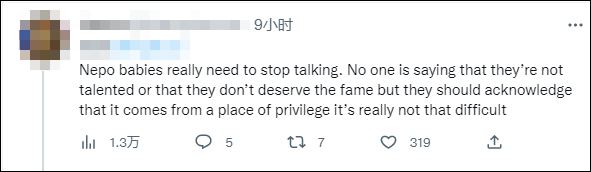 "裙带宝宝真的需要停止说话。没有人说他们没有才华或他们不配出名,但他们应该承认,自己的名声来自其特权地位,这真的没有那么难。"