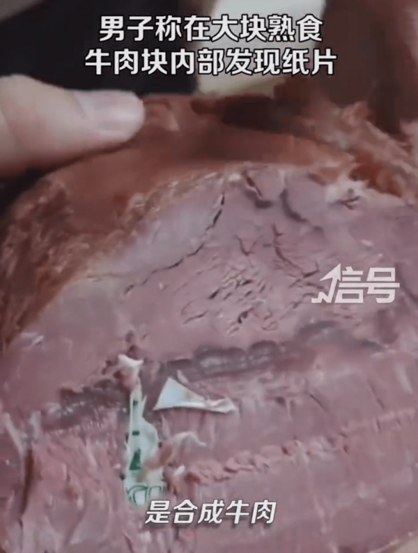 据山东商报援引信号财经:1月7日,在河南驻马店,男子在一大块牛肉中发现碎纸片。