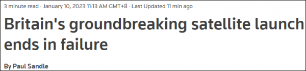 综合英国广播公司(BBC)、路透社9日报道,维珍轨道公司(Virgin Orbit)在当天晚上执行了英国首次本土发射卫星任务,最终运载火箭出现异常,无法进入轨道。报道称,英国试图成为西欧第一个送卫星上太空的国家的努力宣告失败,"欧洲的太空雄心再受打击"。