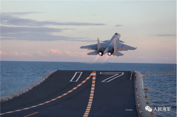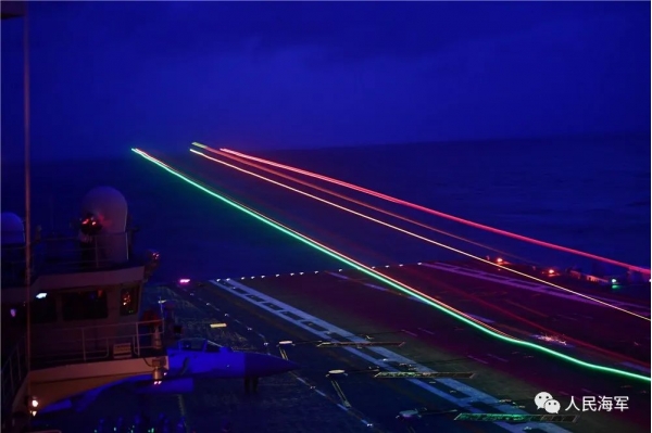 实兵"背靠背"对抗演练结束后,战鹰伴着夕阳陆续返航。加油挂弹、通电检查、惯导对准……山东舰飞行甲板上,舰载机再次出动工作有序进行。星河夜幕下,又一批歼-15战机喷着耀眼的尾焰、伴着巨大的轰鸣呼啸升空……