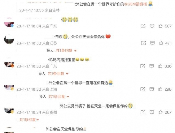 粉丝们纷纷留言安慰邓紫棋:节哀,外公只是去见外婆了,他在天堂会保佑你的,他会在另一个世界一直陪在你的身边、守护着你。