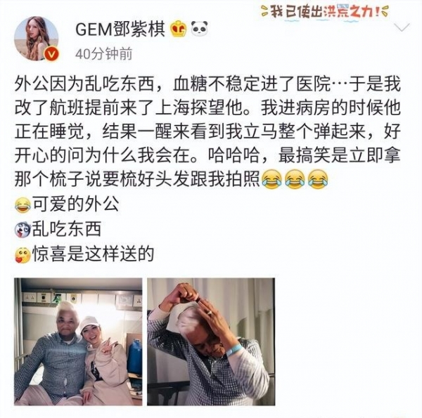 2018年,邓紫棋的外公就曾生病住院过,她当时晒出了病床照,称由于外公乱吃东西,导致血糖不稳定,才进了医院。