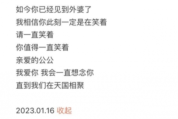 虽然邓紫棋是在1月17日发表的文案,但文案最后的日期是1月16日,说明邓紫棋的爷爷可能是在昨天去世的,没能熬过春节多少让人觉得有些遗憾。