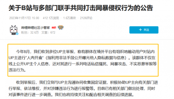 11月17日,针对B站UP主被"开盒"一事,bilibili和中信办从当日起在全国范围内展开"清朗·网络戾气整治"专项行动,严惩"网络厕所"和"开盒挂人"。