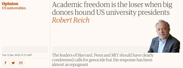 美国前劳工部长、加州大学伯克利分校教授罗伯特·赖克日前在英国《卫报》发文指出,大学董事会里通常有许多富裕的校友,他们经常否决那些怀有冒犯性观点的大学校长候选人。但直到这场风波,主要捐助者才如此明目张胆地利用财务影响力将校长赶下台。