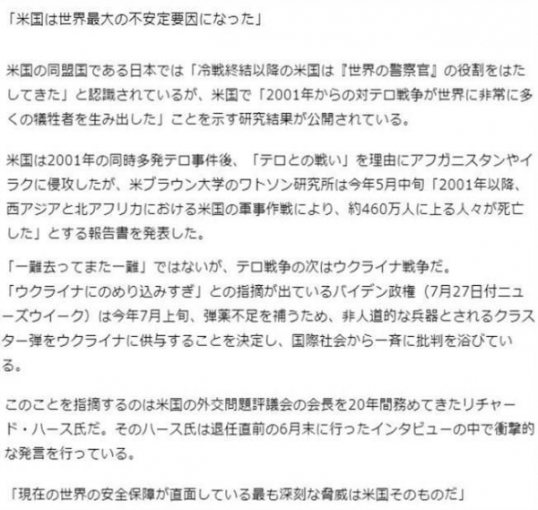 有日本媒体发文指出,2001年"9·11"事件发生后,美国发起的所谓"反恐战争"在全世界造成了巨大伤亡。如今美国又在深度介入乌克兰危机,甚至向乌克兰提供极不人道的集束弹药等武器装备,遭到国际社会的一致谴责。