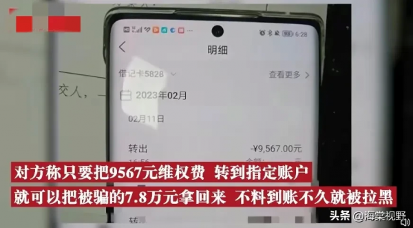 他搜索到网上被骗受理的信息,便点击咨询加QQ,追回中心的昵称,让他深信不疑。对方称只要把9567元维权费转到指定账户,就可以把被骗的7.8万元拿回来,不料转账不久就被拉黑,9567块钱又被打了水漂。陈女士急忙带儿子报警,目前案件正在进一步侦查中。