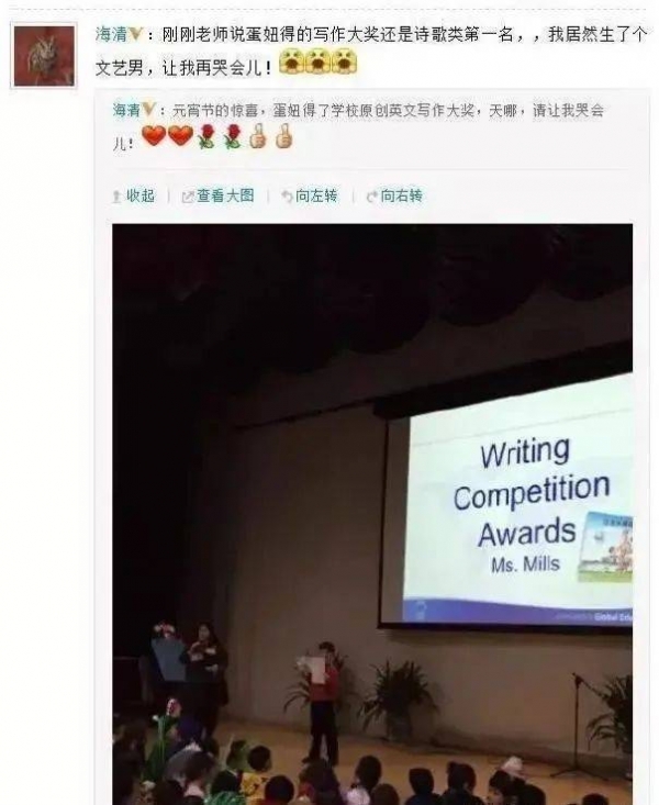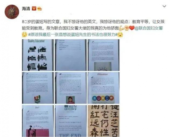 说起海清儿子"蛋妞",真的是别人家的孩子......不止是有料君前面提到的乖巧懂事,懂得心疼妈妈。关键人家还是个学霸,10岁时画的画有人愿意出3万收购,11岁参加亚洲游泳锦标赛,就能勇夺三金一银。8岁写的文章就懂得教育要平等,男女孩要平等↓