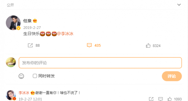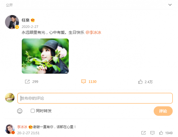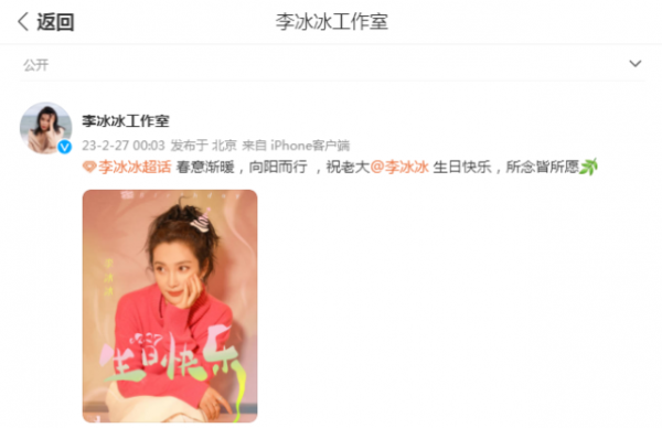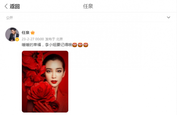 而李冰冰工作室则是在零点三分的时候,才晒出了海报送祝福:"春意渐暖,向阳而行 ,祝老大@李冰冰 生日快乐,所念皆所愿",这也再次证明了任泉的真心。