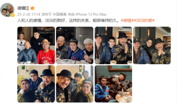 2月26日,演员徐锦江更新个人社交动态,罕见分享全家福。徐锦江带着老婆殷祝平和儿子徐菲一起与几位老友聚会,并诚挚发文:"人和人的感情,淡淡的就好,这样的关系,能够维持的久"。