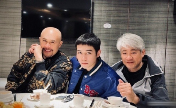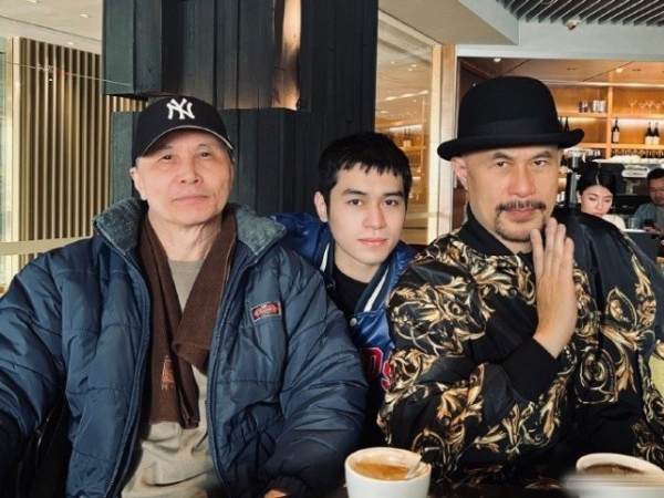 徐锦江父子与演员尹扬明同框,徐锦江发型不改,依旧是标志性的大光头。