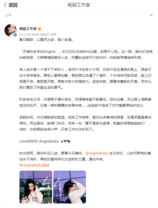 杨颖工作室也同样是卡点送上了祝福,并且配上了一大段特别有深意的文案,讲述了Angelababy在刚刚过去的这一年里,工作中的点点滴滴,看得出来她十分的敬业,还有她和粉丝双向奔赴的爱,这也被赞是人美心善了,确实值得大家的喜爱。