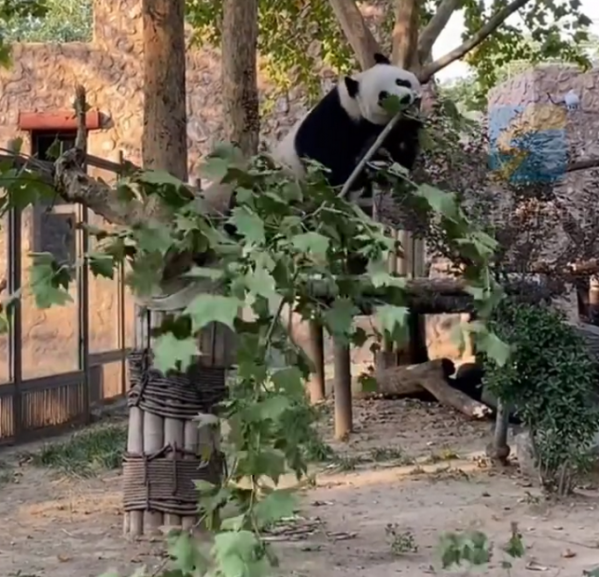 在济南动物园内,一只大熊猫吃饱喝足后,爬上一棵大树,用嘴轻松掰断一根树枝,让现场游客连连称赞,这功夫一看就是专业选手。