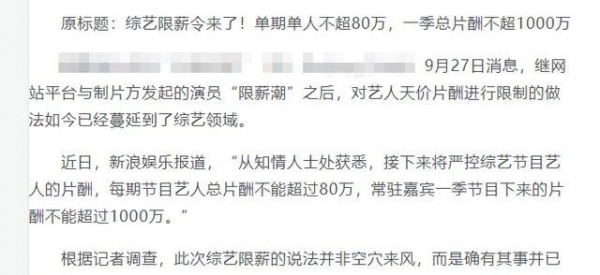 要求严控综艺节目艺人的片酬,每期节目艺人总片酬不能超过80万元,常驻嘉宾一季节目下来的片酬不能超过1000万元。