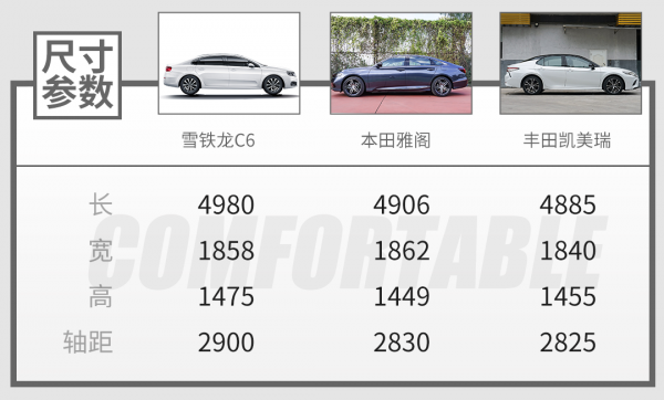 说回雪铁龙C6这款车,网友为何一致觉得它优惠9万元很香?主要还是因为它产品力足够强,一方面强在车身尺寸上,其定位为中型轿车,但比雅阁、凯美瑞、迈腾等主流车型还要大,长宽高分别为4980/1858/1475mm,轴距为2900mm。