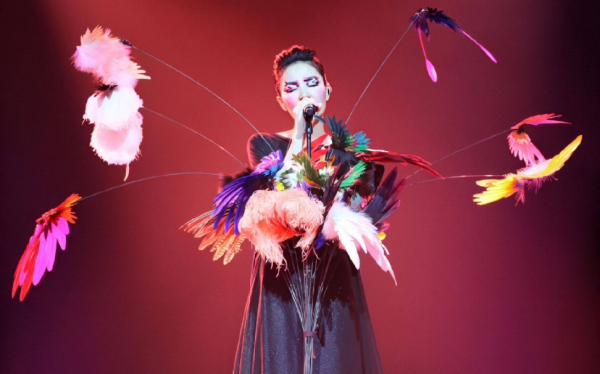 王菲站在百鸟飞舞的绚烂舞台上,唱了那首谢霆锋曾为她写下的《MV》。