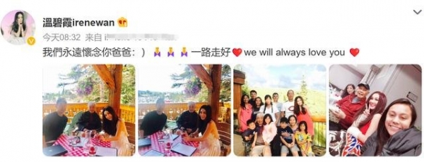 3月20日,温碧霞的豪门公公去世,她在社交平台上发文悼念称:"我们永远怀念你,爸爸,一路走好。"