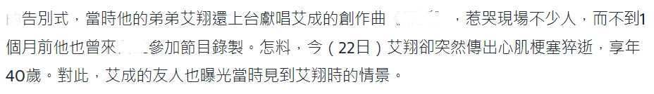 后续在艾成告别仪式上,艾成的妻子王瞳和他的母亲抱头痛哭,弟弟艾翔当时也在场,还演唱了哥哥艾成的成名曲。