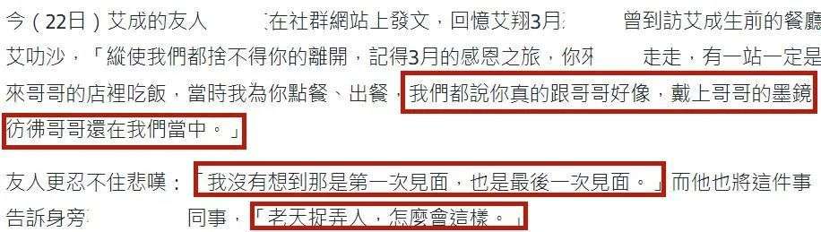 艾成友人回忆起这对一前一后同龄离世的明星兄弟,都感慨天意弄人,他们其实也只见过艾翔一次,第一面也成了最后一面,一起在艾成餐厅吃饭的时候,友人还感慨艾翔和艾成好像,仿佛艾成还在他们当中。