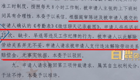 最终,辞退协商未果,公司并未取消其工位,该女子可以正常上班。"回到办公区后,她直接打电话给劳动仲裁,上庭那天她又迟到了16分钟!"卢先生说,裁决结果显示,公司是合法辞退,按全勤的工资发放,补偿10天的工资,驳回了她的申请。