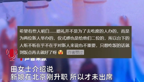 田女士介绍说,新娘在北京刚升职,所以才未出席,新娘是因为工作的原因,所以才没有出席自己的婚礼,所以田女士才会说,这是一场比较简单的婚礼。
