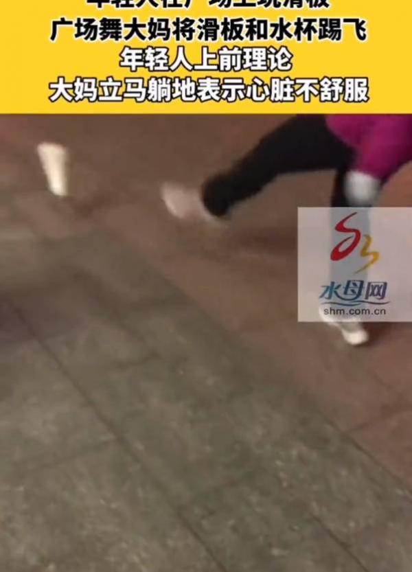 原标题:广场舞大妈为抢场地盘踢飞年轻人滑板水杯,还躺倒在地称心脏疼,当事人:报警后向大妈道歉,滑板水杯也没赔