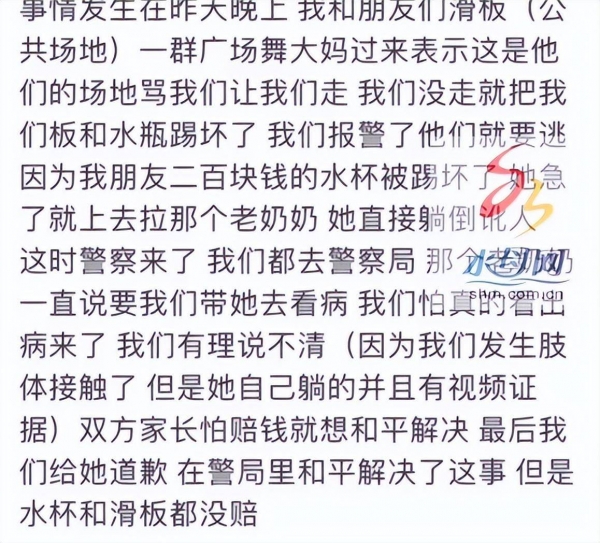 根据当事人介绍,当时自己正和一群朋友玩滑板,一群跳广场舞的大妈走过来说这里是她们的地盘,然后叫骂着让自己和朋友离开,还踢坏了自己朋友两百块钱的水杯。随后报了警,最后是自己和朋友们向倒地的阿姨道歉,但水杯和滑板对方却没有赔。