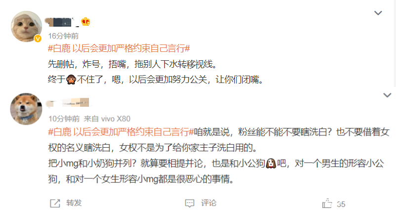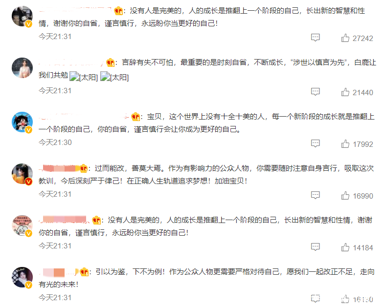 不过,有网友发现在白鹿就言论风波道歉之前,相关的微博已经被删除清空了。虽然部分网友认为白鹿很真诚,知错能改是好的,人无完人,更提醒她"作为有影响力的公众人物,需要随时注意自身言行,吸取这次教训,今后深刻严于律己!"