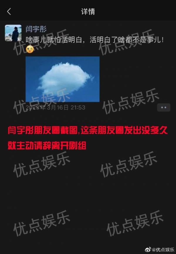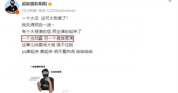 4月26日,知名八卦娱记"超能摄影阳阳"(阳阳)在社交网提前预告一个"大瓜",卖关子称可太刺激了,吊足吃瓜群众们的胃口。从狗仔阳阳透露的线索来看,这则"大瓜"来自于"大导演的剧组,两位主演竟然吵起来了,一个当戏霸、一个直接罢演",而且事情闹大快捂不住了。