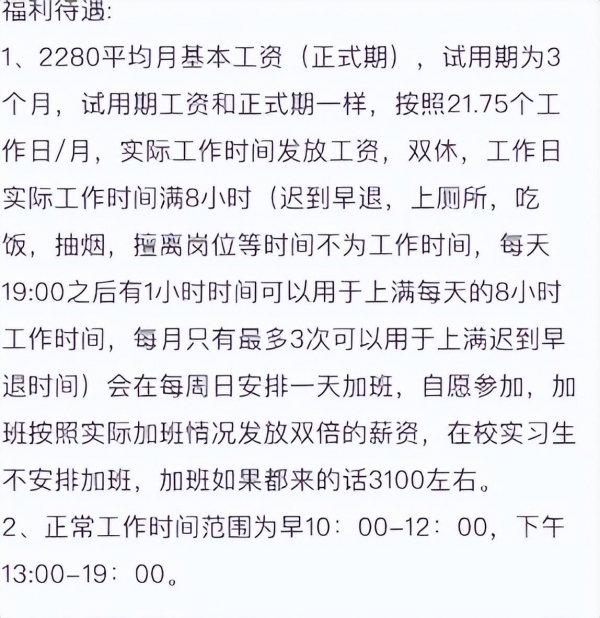 其中,flutter岗位正式期是2280元的平均月基本工资,每周日会安排一天加班,自愿参加,薪水双倍发放,如果加班全部参与,则能拿到3100元左右的加班工资。