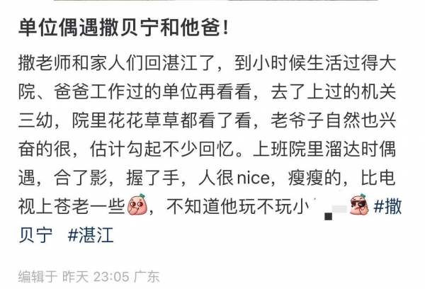 根据偶遇两人的网友描述,撒贝宁带着父亲回湛江是为了重游故里,两个人不仅去了小时候生活的大院,还在撒爸爸工作过的单位、撒贝宁上过的机关小学流连忘返,撒爸爸更是全程兴奋,脸上始终带着笑容。