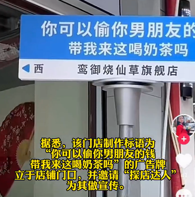 据悉,该门店制作标语为"你可以偷你男朋友的钱带我来这喝奶茶吗"的广告牌立于店铺门口,并邀请"探店达人"为其做宣传。
