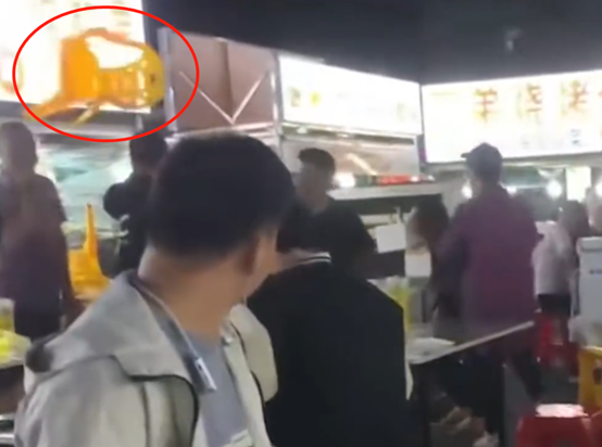 视频中,一男子把椅子砸向摊位的招牌,随后又把桌子推翻在地。他大声喊道:"哇噻!一千块中三千万!"身边有不少人围观,有人上前拉住他,有人说:"干到头了,干到头了。"也有人很冷静地吃自己的食物。