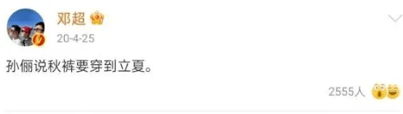 邓超曾吐槽孙俪说秋裤要穿到立夏,而孙俪本人也曾因大热天穿加绒裤而被热到快中暑,还吐槽自己对温度的判断力智商为0。