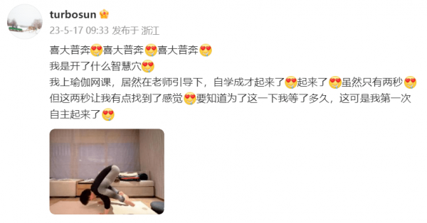 5月17日,孙俪发文分享好消息,称自己在瑜伽老师的引导下,自学成才,终于能倒立起来了。