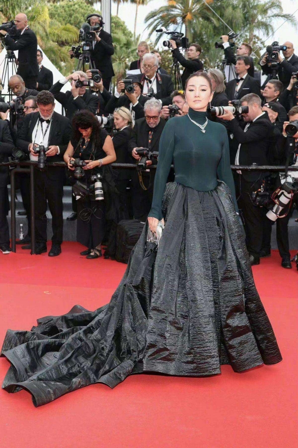 巩俐的红毯穿搭一直都是有简约的审美理念在其中,主要就是突出气质,让个人的美有辨识度。黑色蕴藏着无限的能量,紧身的上半部分配合着提高腰线的设计,加上整体黑色的设计,将个人的气场发挥到极致。
