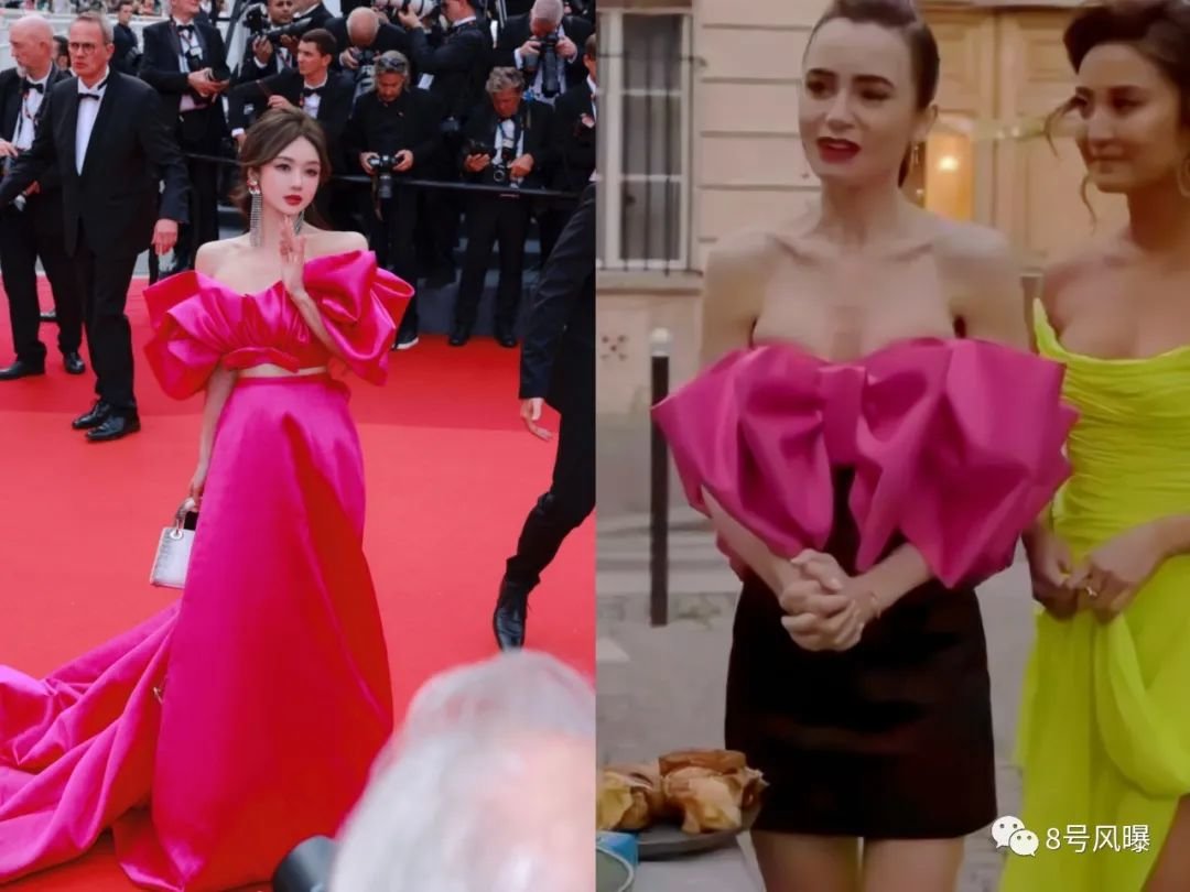 张林超穿了一身粉色礼服裙登场,而这一套似是电视剧《艾米丽在巴黎》的主角同款。