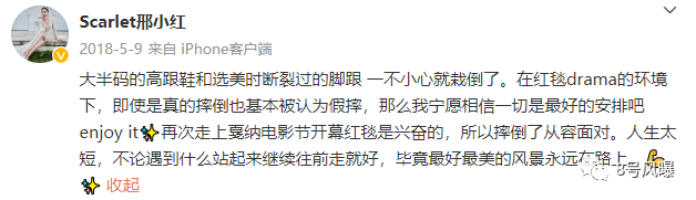 事后邢小红在微博表示,自己摔倒是因为高跟鞋太高了,并不是故意假摔。