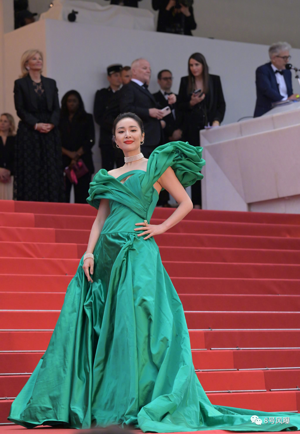 她穿着Georges Chakra 2023春夏高定系列的翠绿色礼服裙登场,高贵大气,这一身既显得她很活泼,又衬得她很高级。