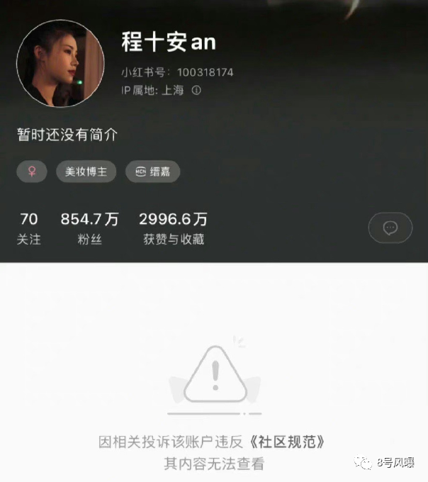16日,网友发现程十安的小红书账号异常,疑似被封。