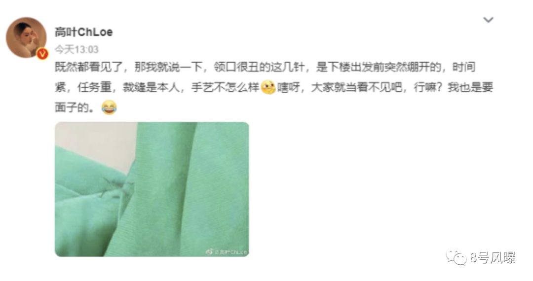 随后,高叶本人亲自回应说礼服是自己缝的,还请大家当做没看见,给她留一点面子。