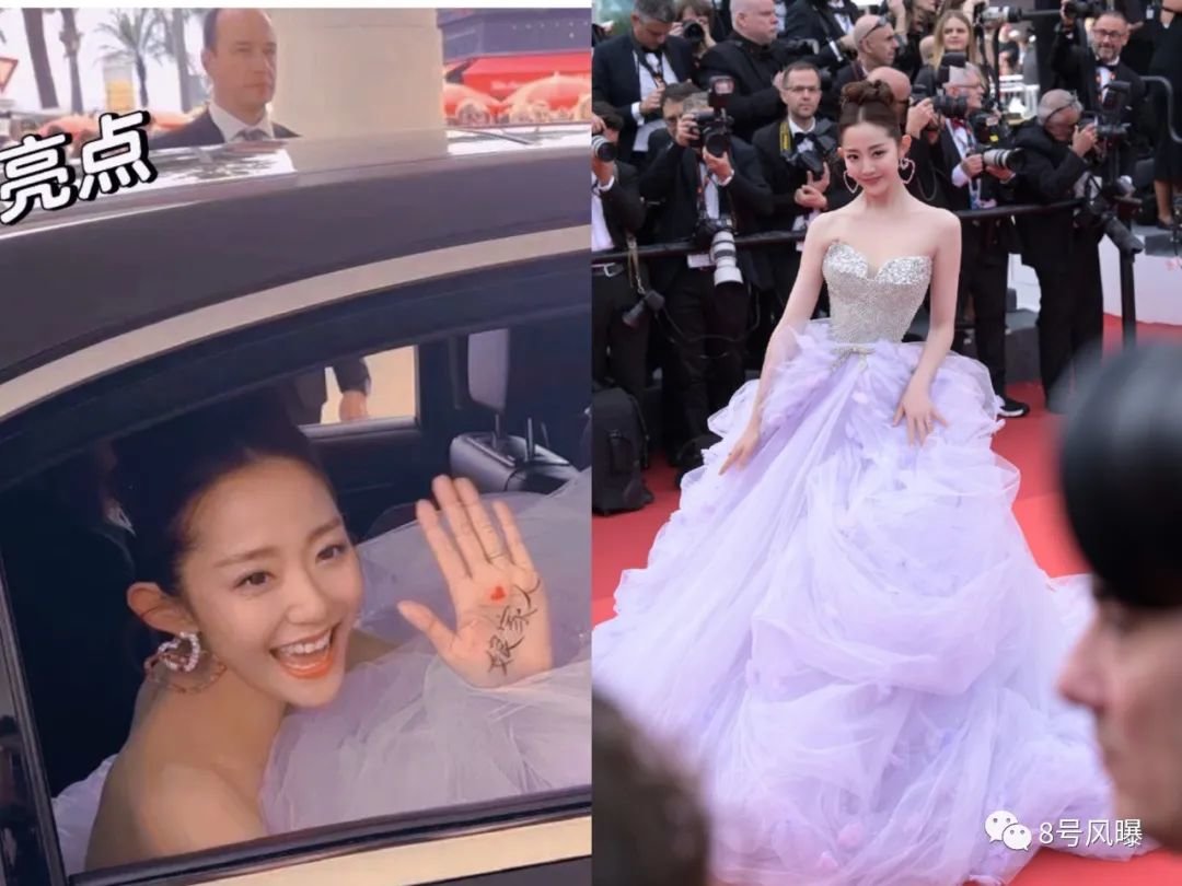 在红毯走秀时,她穿的是一套淡紫色蓬蓬裙,在热搜上,她这套造型叫"戛纳在逃星黛露",她还在手上写下了"娘家人"。