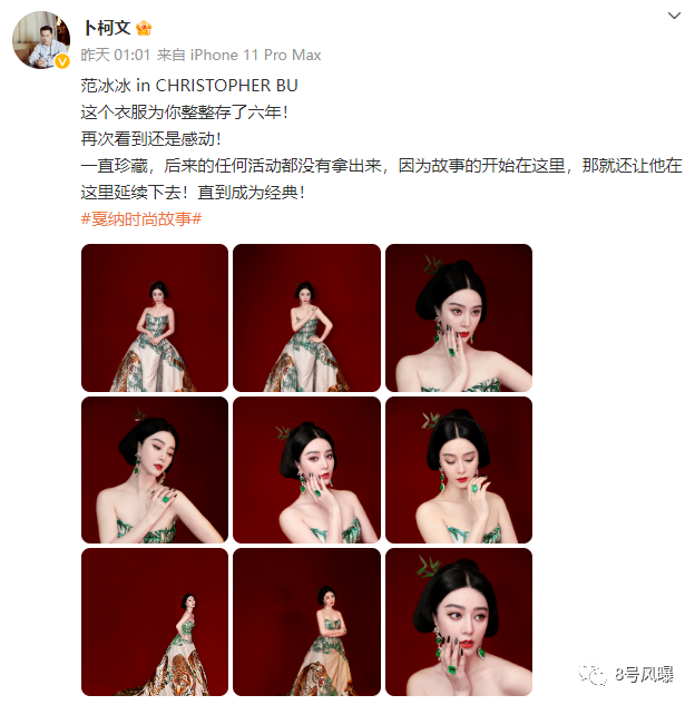 这套礼服来自Christopher Bu,是卜柯文之前就设计完成的一件作品,但为了能让范冰冰在合适的场合穿上它,一等就是6年。