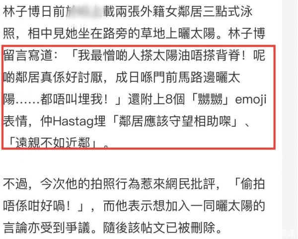 然而,最近他的行为却被网友怒批。起因是林子博晒出一组照片,自称最讨厌露背晒日光浴的人,邻居真的很讨厌,每天在门前的马路边晒日光浴,都没有叫他。在这段话后面,林子博还加上了很多愤怒的表情。
